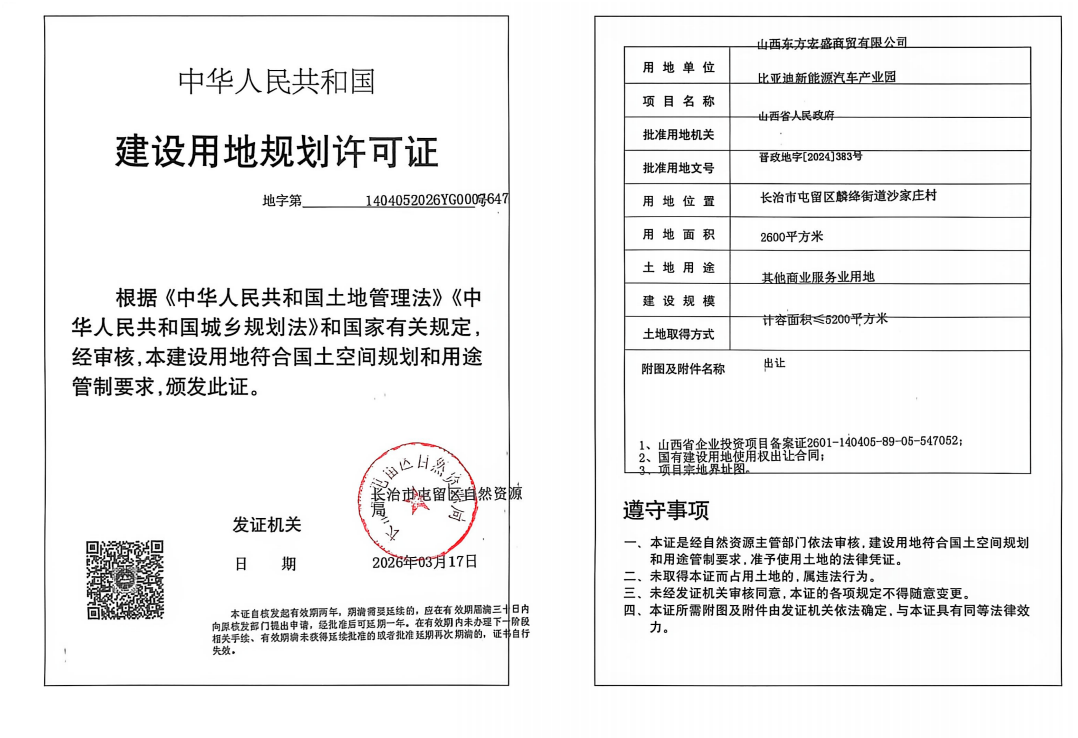根据有关规定,现对比亚迪新能源汽车产业园项目用地规划许可批后公开,具体内容如下: