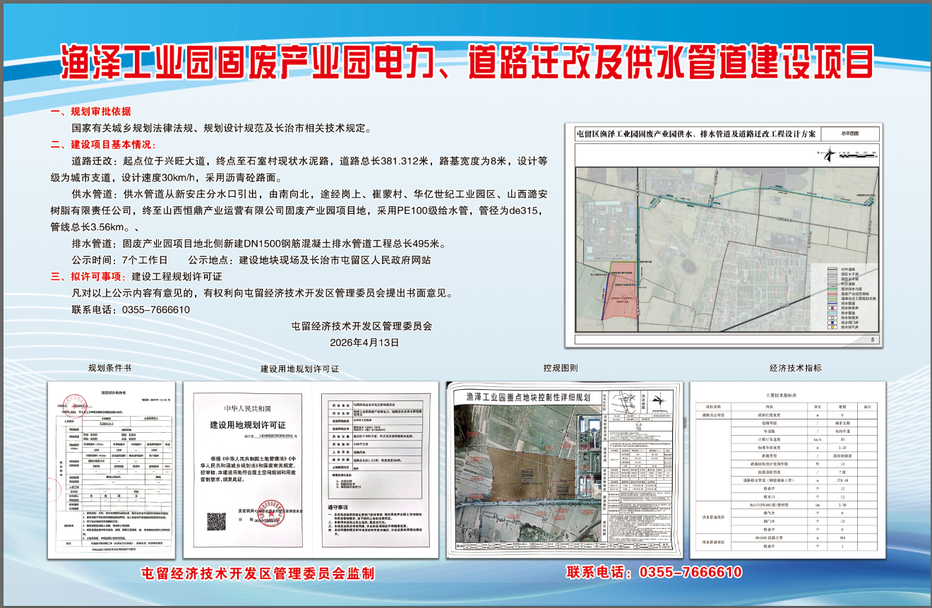 屯留经济技术开发区管理委员会新建渔泽工业园固废产业园电力、道路迁改及供水管道建设项目,该项目用地位于控制性详细规划YZD-01-01地块,道路迁改用地位置起点位于兴旺大道,终点至石室村现状水泥路;供水管道从新安庄分水口引出,由南向北,途径岗上、崔蒙村、华亿世纪工业园区、山西潞安树脂有限责任公司,终至山西桓鼎产业运营有限公司固废产业园项目地;排水管道位于固废产业园项目地北侧,总长495米。经审查符合规划要求,现予公示,公示时间为7个工作日。如有异议,可向我单位行政审批服务中心反映。